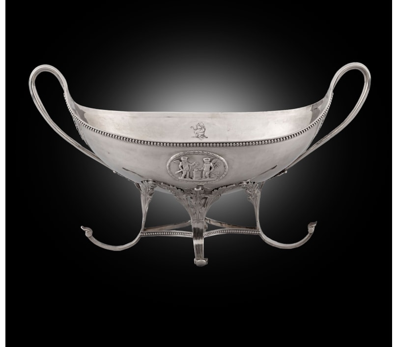 The centrepiece on four fluted feet conjoined with a beaded wire and terminated it acanthus foliage. The plain boat-shaped body bearing two neo-classical plaquettes with scenes of Psyche and Cupid together with the eternal flame and butterfly symbolising the reward of eternal love and happiness.