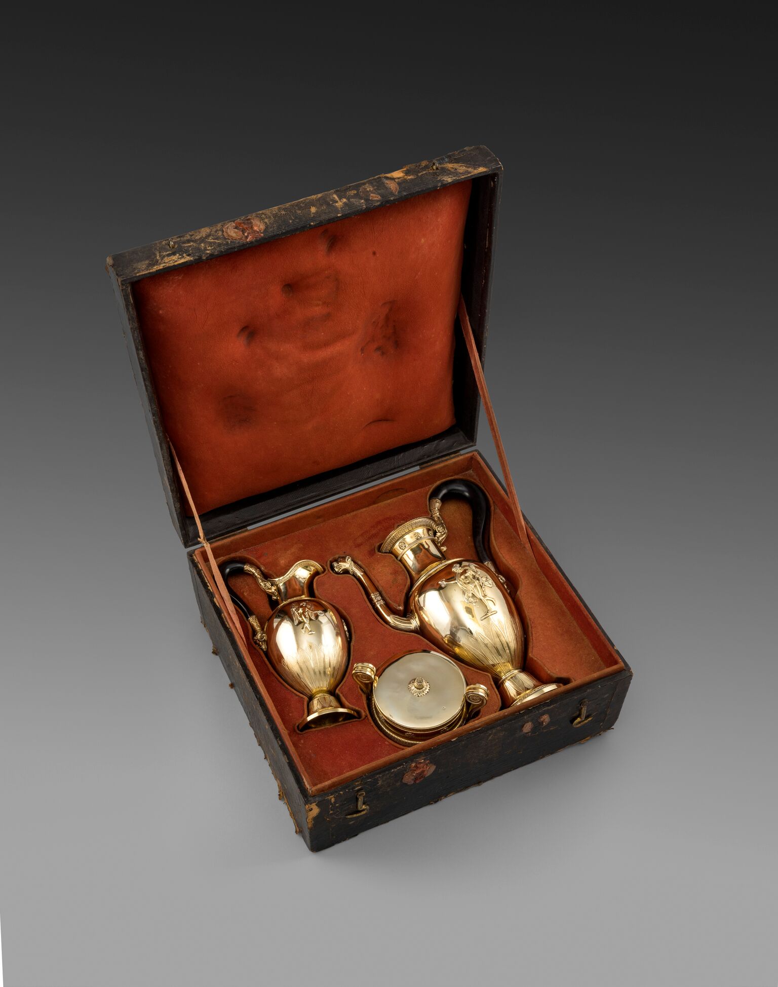 The records at Maison Odiot suggest that the present coffee service is the one ordered by Count Golovkine of Vienna, entered in the Odiot ledgers on July 20, 1819. An identical service was ordered by the Duc de la Varguyon on October 1 1816, when it was described as “une cafetiere a Gorge, un pot a crème et un sucrier Etrusque.” The three pieces together with the fitted case cost 650 livres. Another similar but larger service was commissioned by S.A.I. Prince Napoleon, and is illustrated in Les Grands Orfevres, Hachette 1965, pp.292-193.