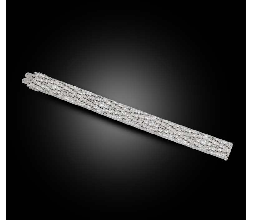 The smoothly articulated platinum strap bracelet intricately pierced in a fine grid pattern inspired by lace embroidery, set with circular-cut diamonds in a pattern reminiscent of silk moiré, the galleries chased with foliate scrolls.