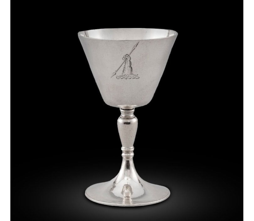 This type of wine cup, quite plain apart from the engraving of the crest or the initials, began to be produced during the Seventeenth- Century, although a few examples are known from the previous century. The simple lines design was in stark contrast to highly decorated and less modestly shaped Elizabethan cup models. Despite their simplicity, this design persisted for about another half-century and underwent not considerable design variations. The abandonment of this type of wine cup was gradual starting from the end of the Seventeenth Century, and it is possible to say that it is a consequence of the development of the English glass industry.