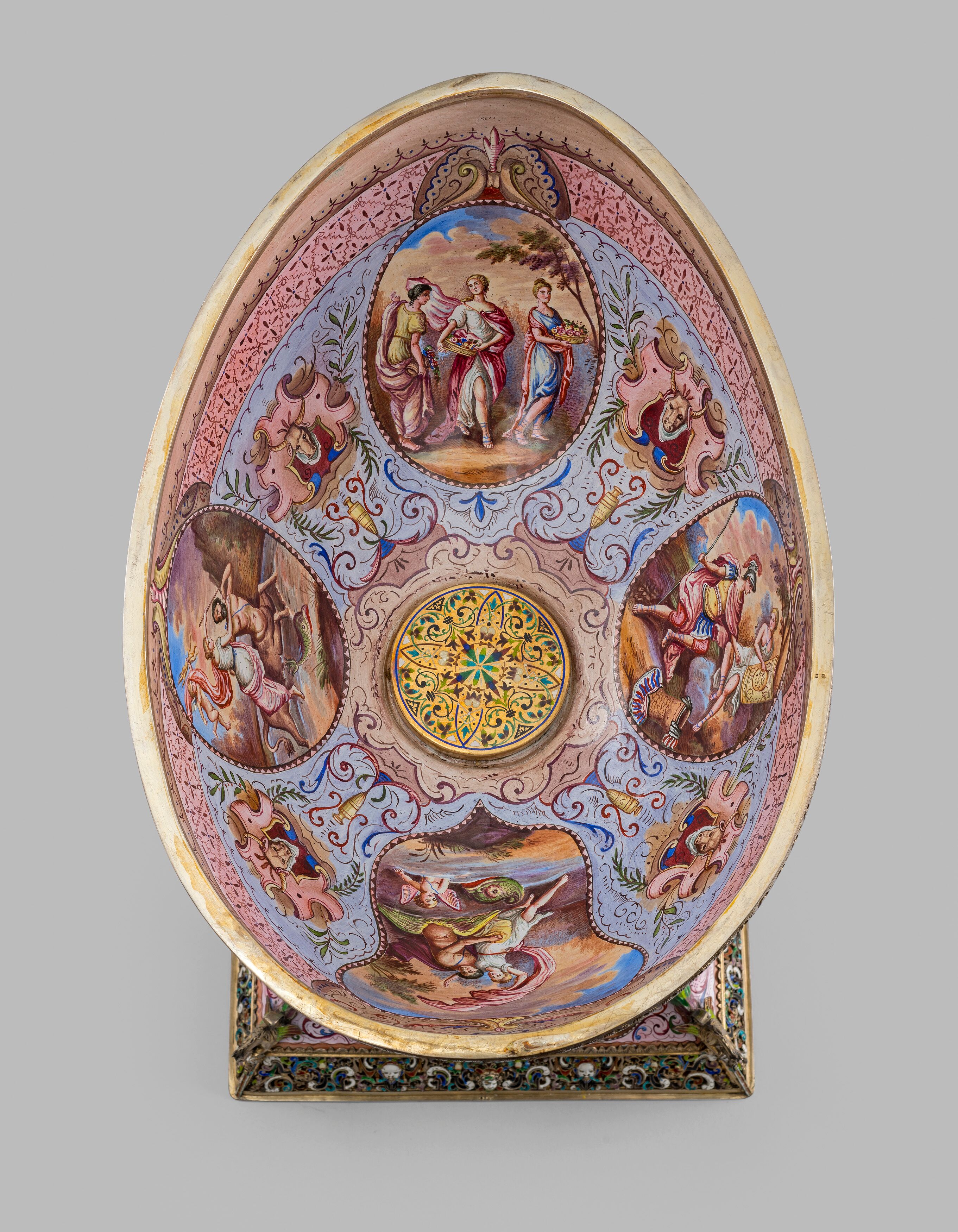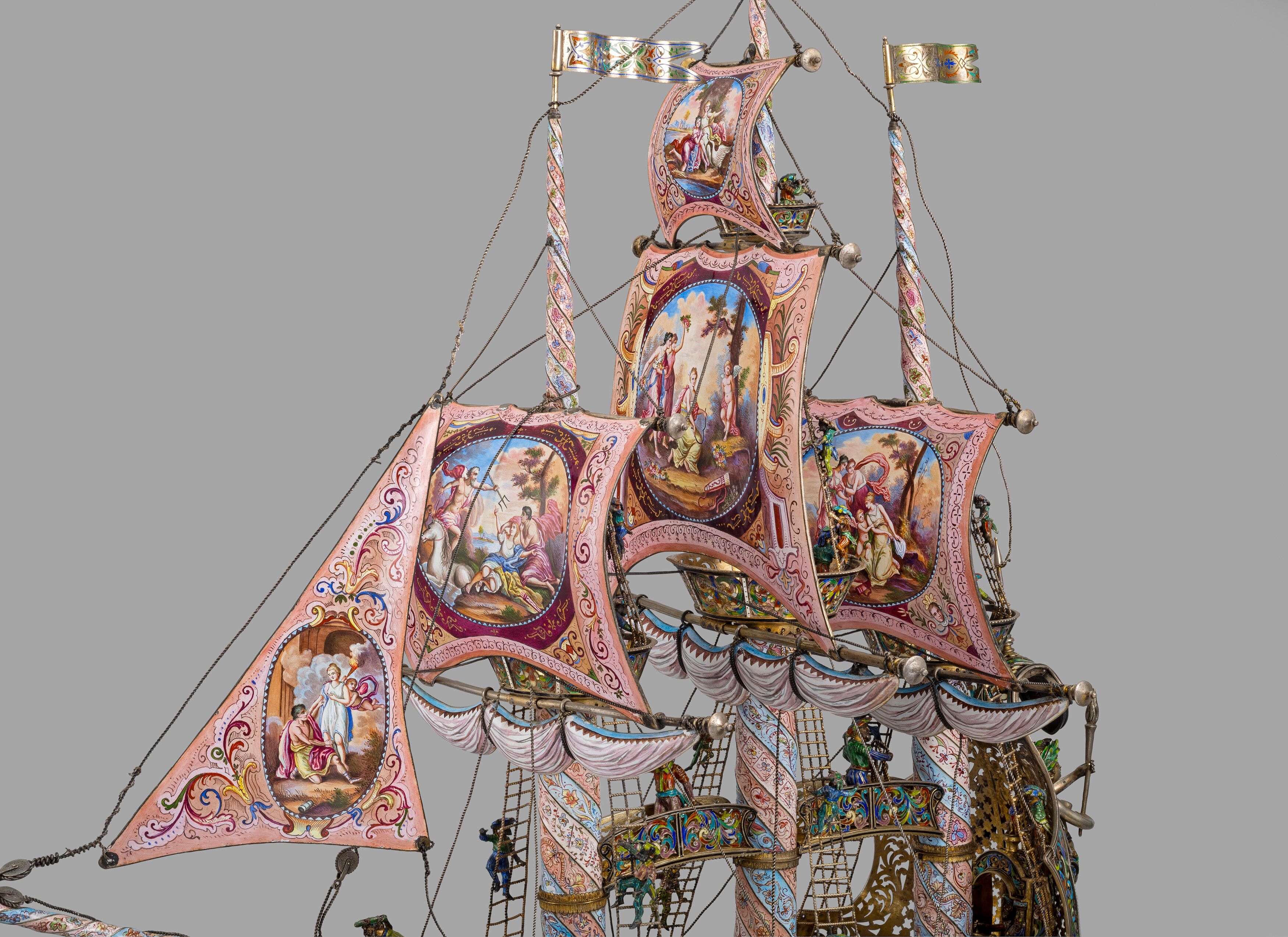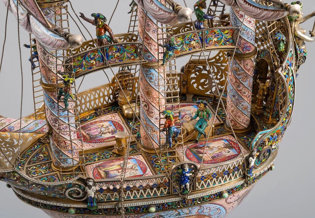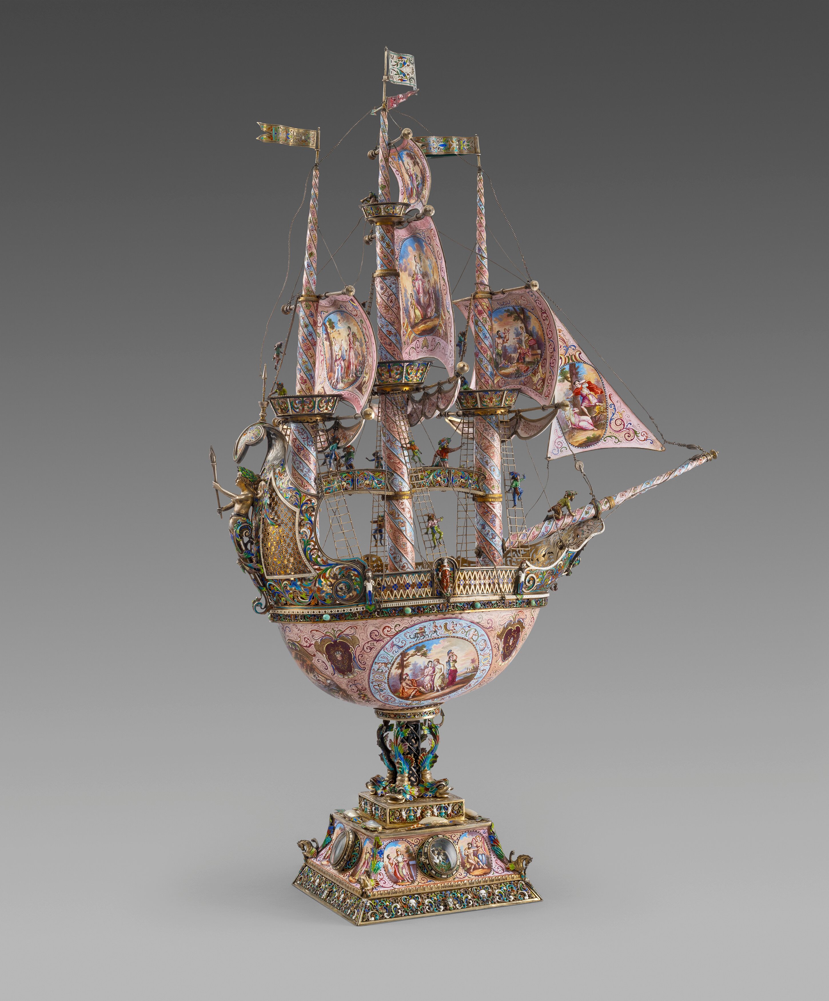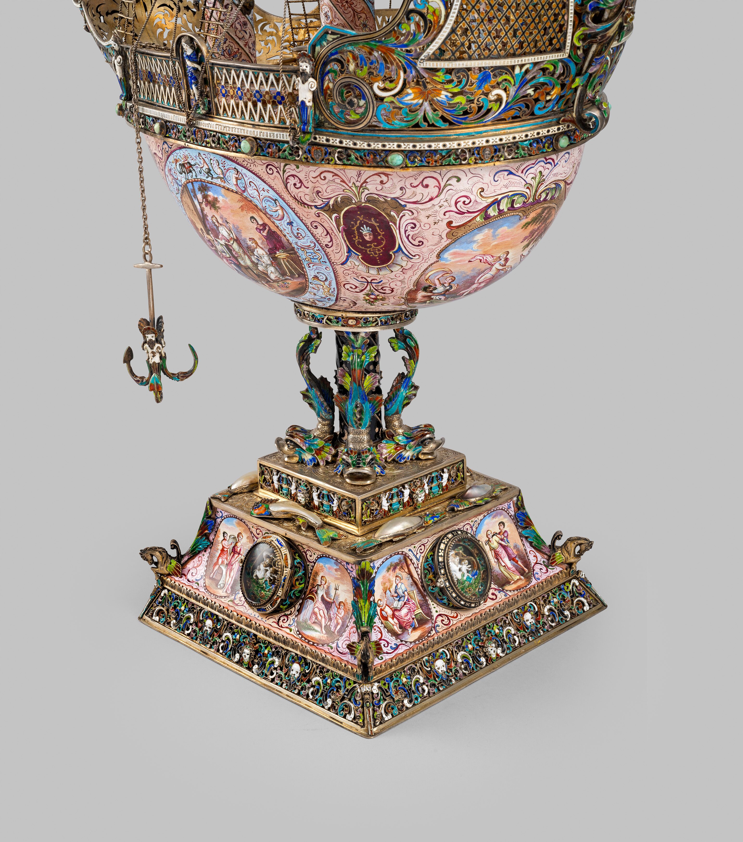 The spiral-turned masts terminating in a flag finial above a crow's nest. Figures of sailors on the main body, the sails decorated on both sides with vegetation, allegorical and mythological scenes. The masts joined by arched bridges, set on an ovoid deck sourmonted by a griffin, the trellis-cast stern applied with a winged mermaid, the interior and exterior of the recessed hull further decorated with foliage, masks and allegorical scenes. Resting on four dolphin supports and spreading square base centred on each side by a glass-enclosed putto and hippocampus.