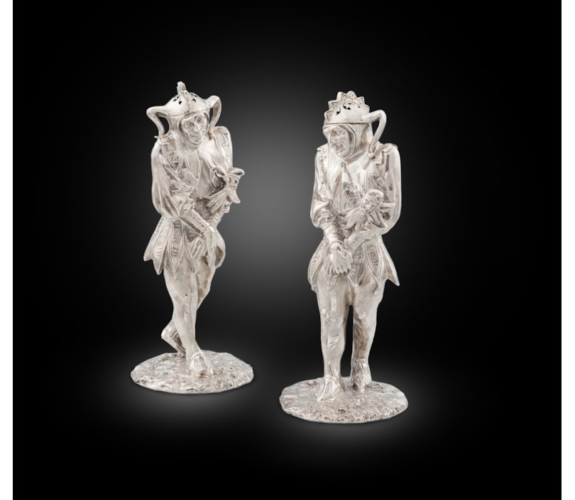 Robert Hennell was an interesting and entertaining man who laughed at the fashions of the trade through the pages of his diary. He travelled extensively in Europe, illustrating his journals with fine pen and ink drawings. He and his brother James Barclay Hennell produced some of the most delightful and gently humorous of all Victorian silver, much based on realistically modelled cast and chased animals, birds and flowers. These Harlequin or Jester pepperettes exemplify this.
