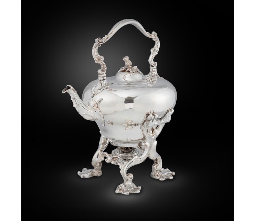 Of understated rococo design. The stand formed of ‘C’ and ‘S’ scrolls on three sprawling stylised shell feet. The body of the kettle of inverted pear shape form with a plain surface, the lid bell shaped with a finely cast thistle finial, surmounted by a swivelling rocaille scroll handle.