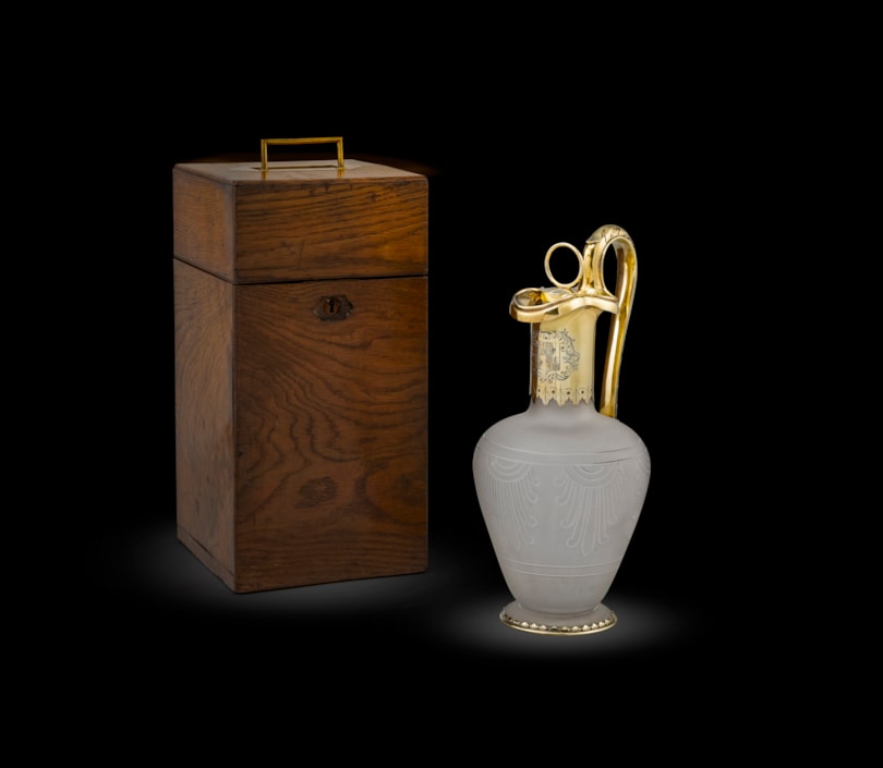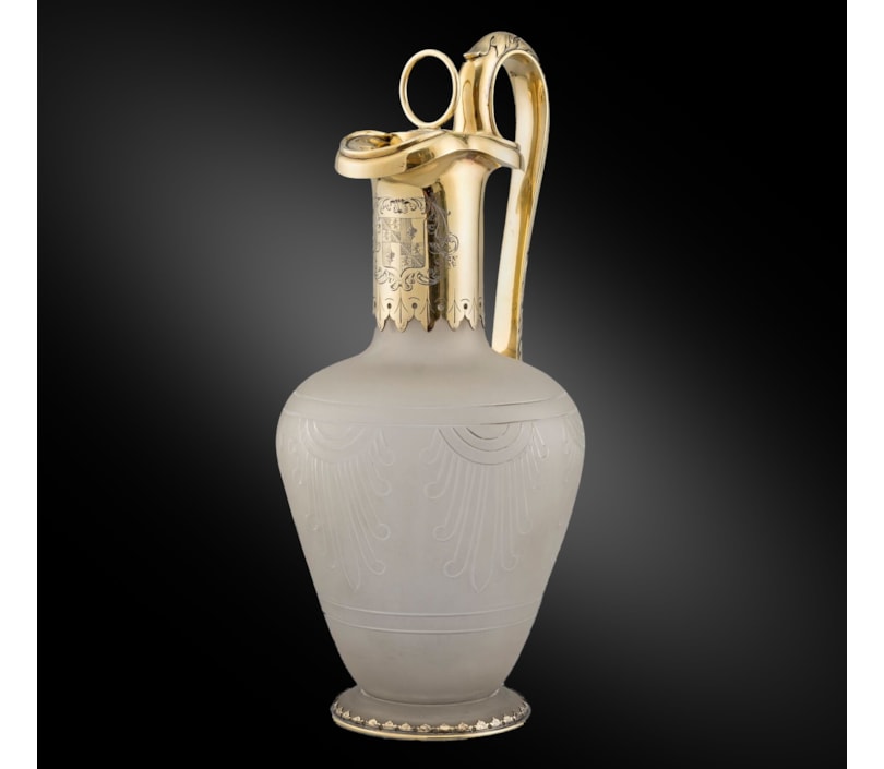 The silver-gilt mount engraved with a contemporary coat-of-arms. The glass body etched and engraved with anthemion.