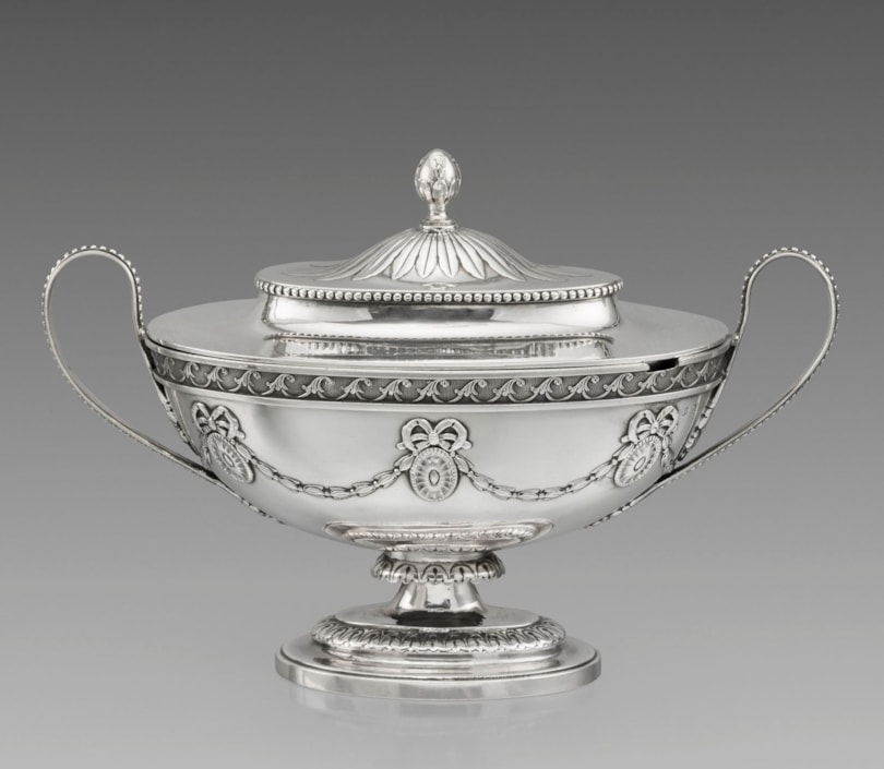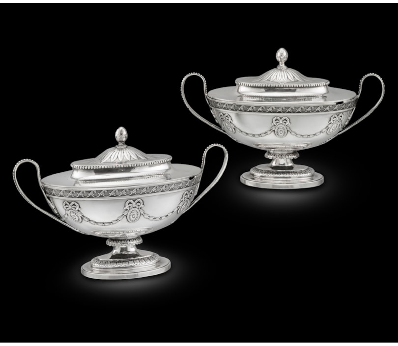 This pair of tureens on pedestal feet decorated with a chased band of bluebells mounted with a similarly decorated band of cast bluebells to the main body. The bodies with cast and applied swags, garlands, and roundels. The top rim with Vitruvian scrolls. The sweeping handles decorated with elegant bead. The covers with similar bead and acanthus décor. The finials formed as artichokes.