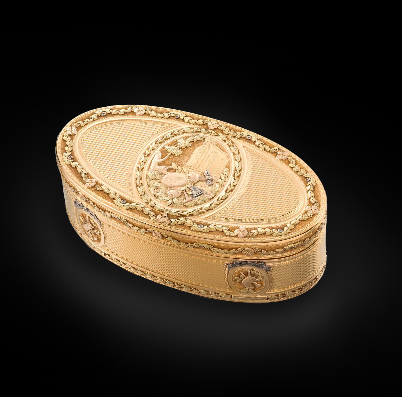 Of oval form, adorned throughout with vari-colour gold applied decoration. The cover featuring a central cartouche depicting musical attributes set within a landscape against a chased background and surrounded by a foliate border, the sides also with small oval cartouches of musical instruments surmounted by tied ribbons.