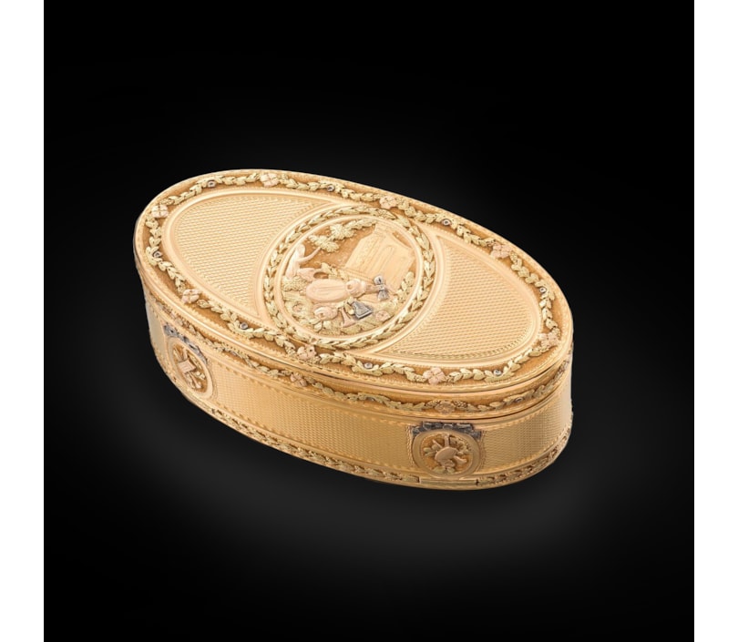 Of oval form, adorned throughout with vari-colour gold applied decoration. The cover featuring a central cartouche depicting musical attributes set within a landscape against a chased background and surrounded by a foliate border, the sides also with small oval cartouches of musical instruments surmounted by tied ribbons.