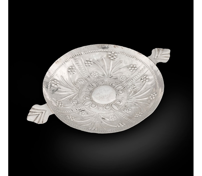 Embossed with floral elements, lines and dots on the bowl and handles. Stippled inscription to centre 'M.S. 1669'.