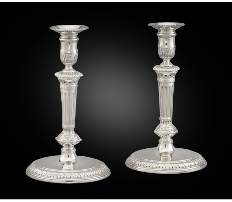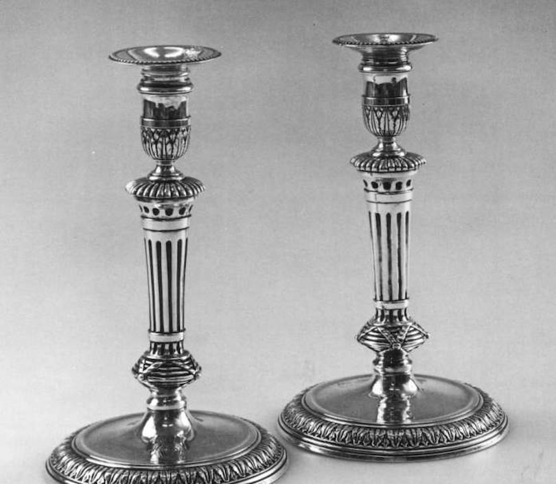 A matching pair of identical design by William Café, London, 1767 and 1771 can be found in the collection of The Israel Museum, Jerusalem [B90.0494(a-d)], engraved with the crest of the Earl of Albemarle. (See additional images). William, with his brother John Café, were the foremost goldsmiths producing candlesticks in the eighteenth century. Therefore, this design would have been known to a maker such as William Cattell.
