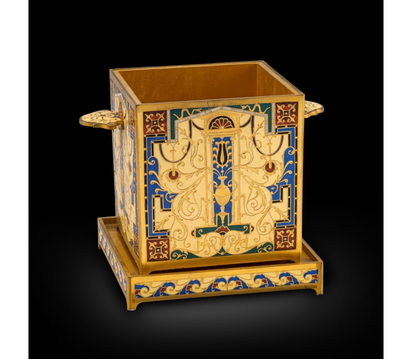 Of square form with two handles either side and raised on a stand, this brilliantly colour vase ‘cache-pot’ designed for plant display is a masterpiece of the Parisian bronze-founder Barbedienne; the design epitomized the love for the antique expressed at the time and reflected in styles of interior decoration in the age of Emperor Napoleon III and Empress Eugenie. The rich cloisonné enamelled tablets to the sides and styled in a Pompeian manner as in the contemporary fashion for ceramic tile ‘cache-pots’ popularized by Messrs. Minton. The bronzing technique executed in the ‘champleve’ manner, illustrative of Barbedienne’s artistic influences from Japanese and Chinese enamels.