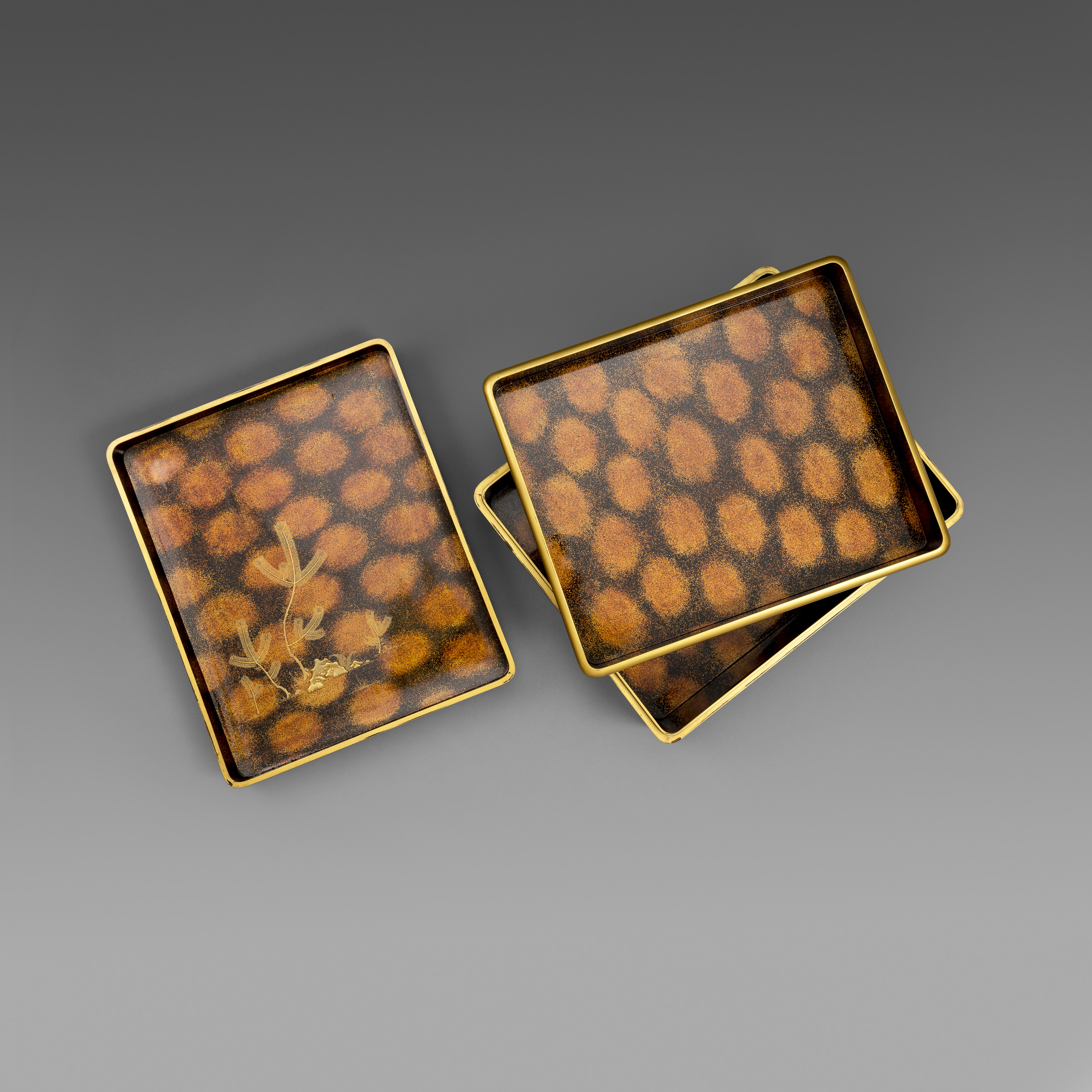 Of rectangular form, opening to reveal a removable tray, exquisitely decorated with inlaid and lacquered gold, takamaki-e and hiramaki-e, the lid featuring a tranquil landscape scene with bamboo and a blossoming tree, similar auspicious foliate decoration to the side and interior of the lid. The box interior finely decorated kin-hira-maki-e on a nashiji ground, creating a shimmering speckled dot pattern. The stunning decoration throughout, executed in varying lacquer techniques, conveys extraordinary skill and artistry.