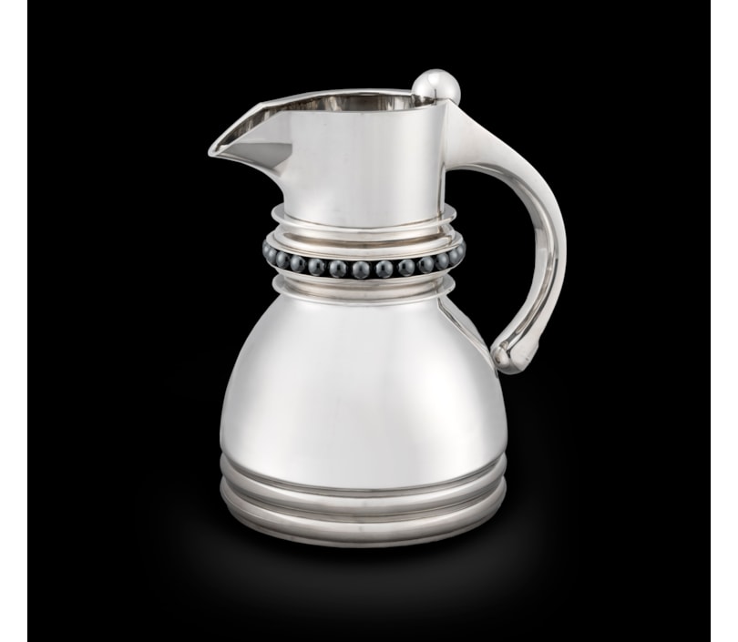 The ewer with a ribbed domed-shaped stem ornamented with circular discs and a strong beaded central feature of oxidized spheres. The D-shaped handle not quite terminating at the main body with a rounded end. The central sectioned complementing a single spherical globe at the top of the handle.