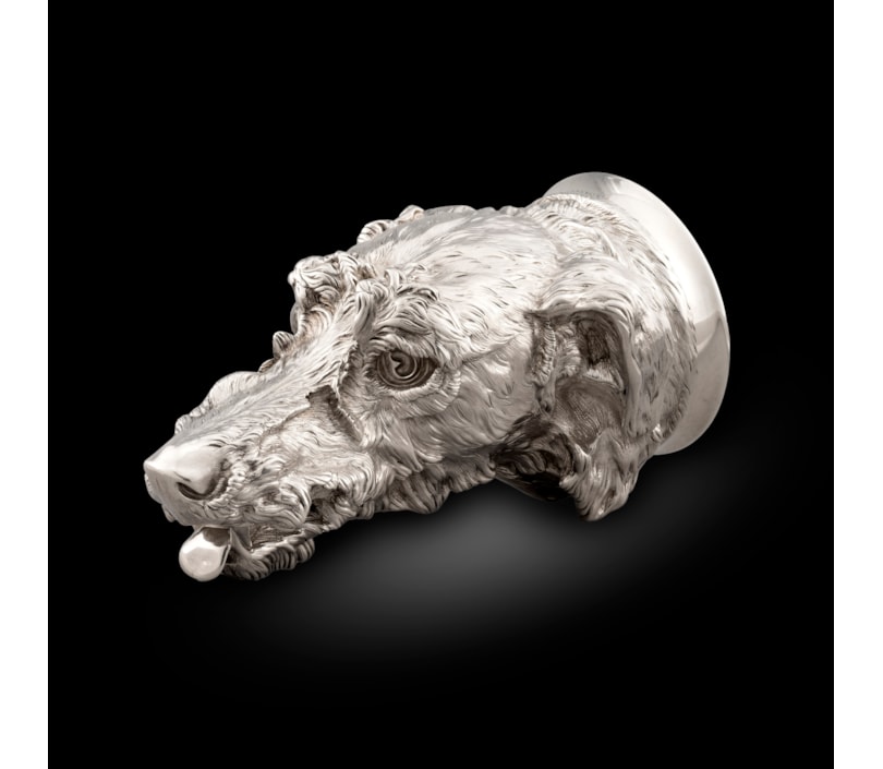 Of the firm Robert Hennell & Sons: Robert Hennell (III) is described in the 1851 census return for 14 Northumberland Street at the age of 56 as a silversmith employing 9 men, together with his wife Jane, aged 47, his daughter aged 26, and his sons, Robert (IV), aged 24, a silver chaser, James Barclay, aged 23, a silver plate worker, Charles E., aged 6, a scholar at home, and Percy, aged 4. J.B. Hennell is further described as a silversmith at the same address in a Sun Insurance policy of 6th January 1855. Following the death in 1868 of R. Hennell (III) the firm was continued in the same style at the same address by R. Hennell (IV). Following the retirement of R. Hennell (IV) on 31st March 1877, R. Hennell & Sons was continued at the same address by J.B. Hennell until his own retirement in 1887 when the firm was sold to Holland, Aldwinckle & Slater. Realistically modelled as a wolf hound this extremely rare form of stirrup cup is of exceptional gauge and quality.