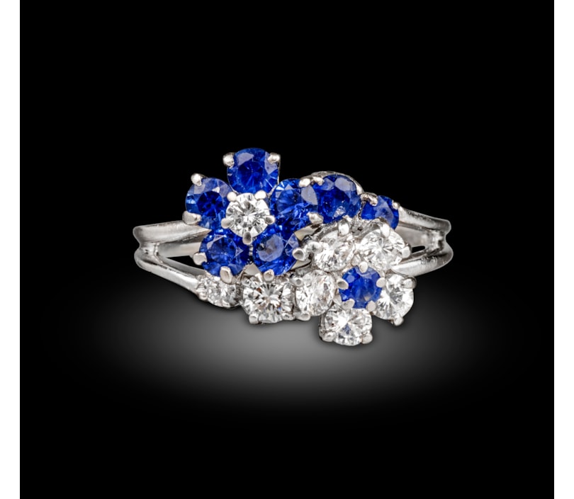 The jewels of the 1950s and 1960s jubilantly reflected the optimism of the post-war era. After the calm, geometric austerity of Art Deco, jewellers once again embraced asymmetry and figural motifs, returning to a lavish use of diamonds and coloured stones as supply chains were re-established and the sumptuary laws of the wartime era were relaxed. As women’s clothing shifted to the more romanticised ‘feminine’ look characterised by corseted waists and voluminous skirts, jewellery followed suit in an explosion of exuberant designs of flowers, birds, butterflies and ribbon scrolls. This ring, with its asymmetrical arrangement of sapphire and diamond flowers is a particularly charming example of these lavish, romantic jewels.