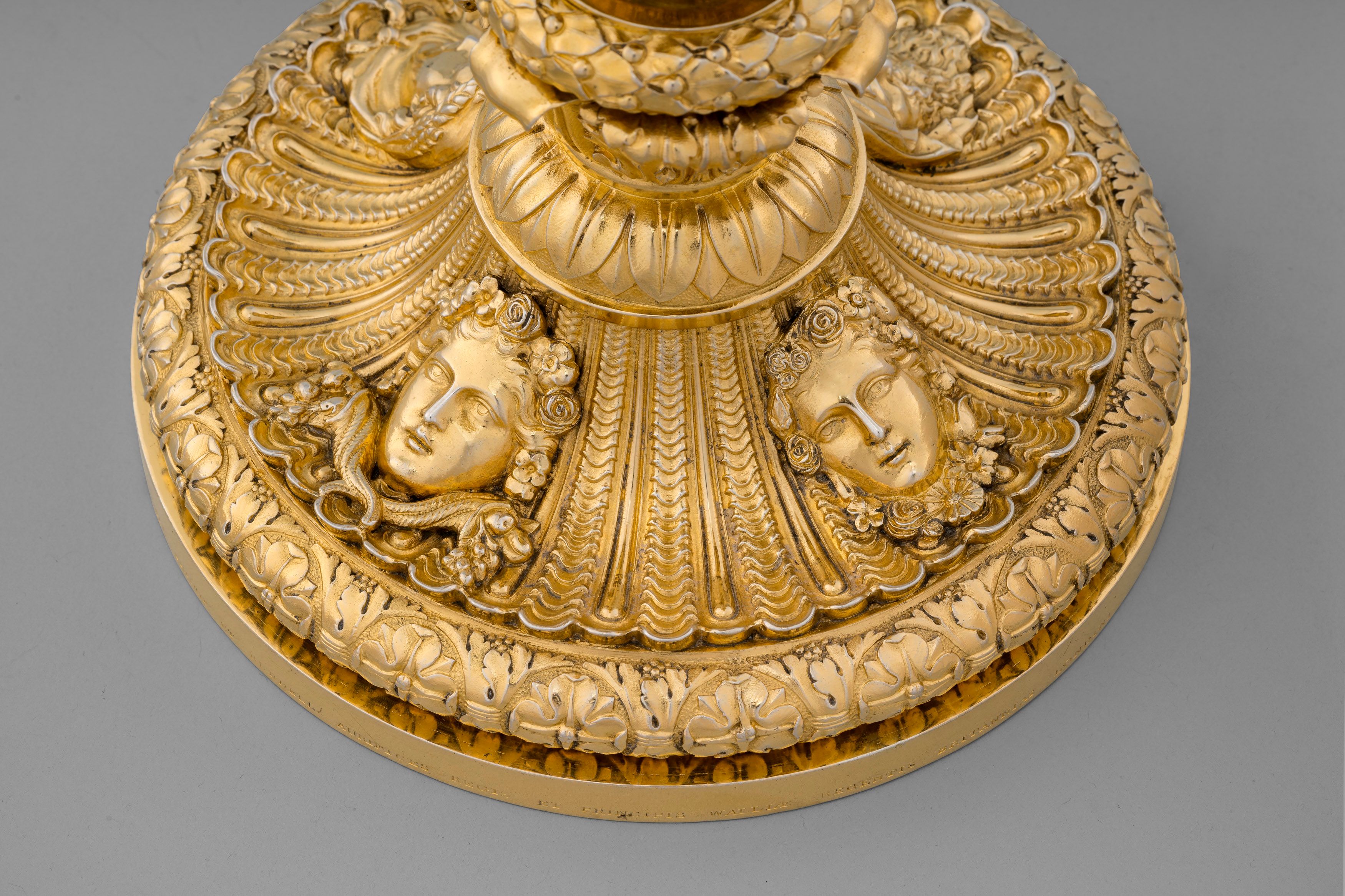 Of cast and gilded silver, the circular bases mounted with heads of the four seasons, the baluster stem decorated with leaves and flowers. Stamped on base "Rundell Bridge Et Rundell Aurifices Regis Et Principis Wallie Regentis Britannias Londini." Engraved on bases and removable sconces with a double crest and with the initials BC below a coronet for Burdett-Coutts.
