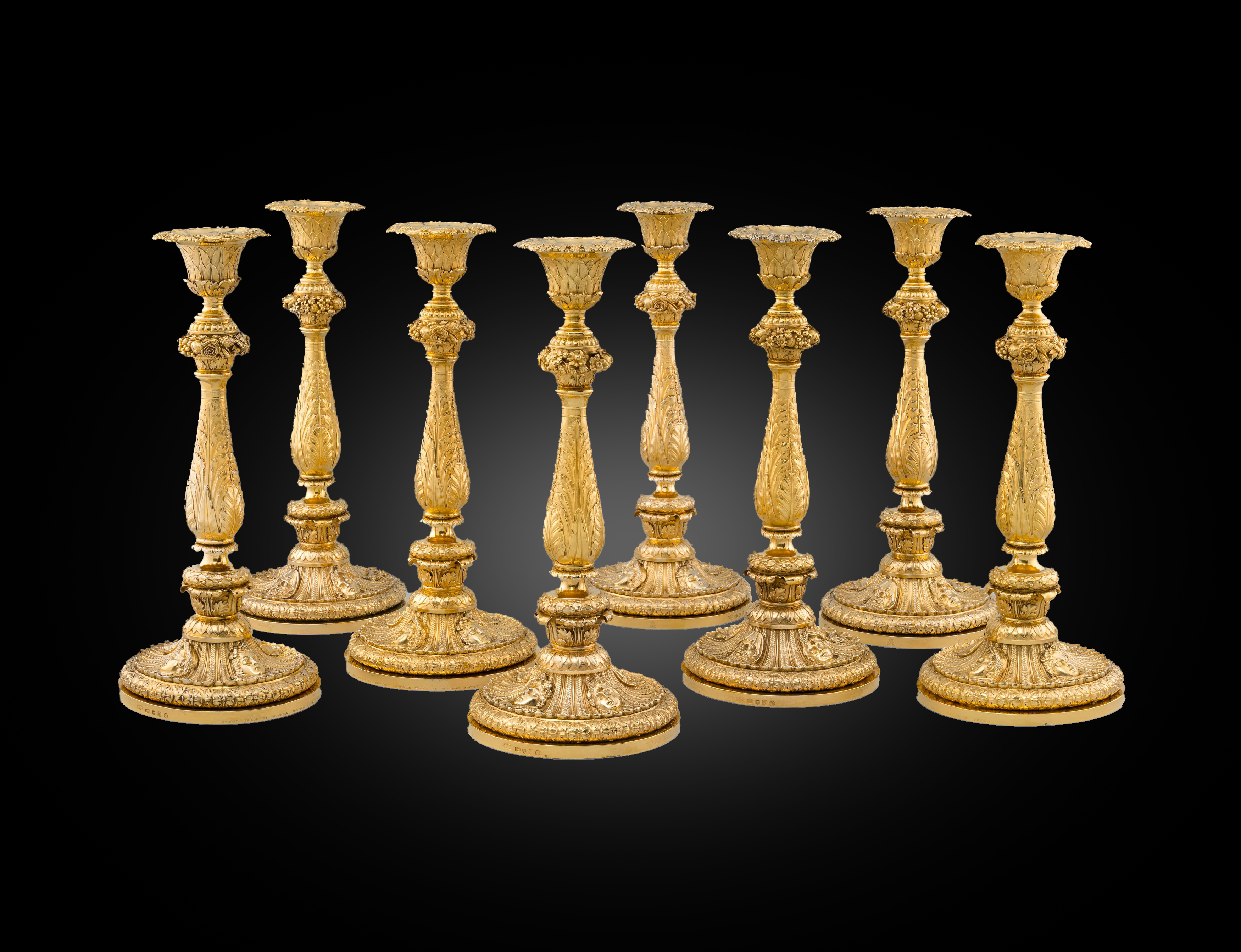 These are the only set of eight candlesticks known to exist by Paul Storr. They are also among the largest and most ambitious candlesticks made in Britain in the 19th century. Another instance of Storr doing his very best work on behalf of Rundell's, they are in superb condition, with crisp decoration and brilliant gilding, and amongst the finest examples of Paul Storr's work anywhere in the world. The double crests are those of Watson-Taylor for George and Anna Watson-Taylor.