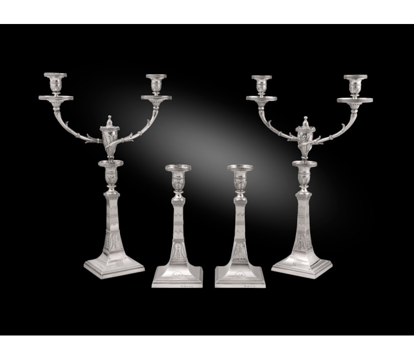 The candlesticks and candelabra of tapered square form, decorated with bands of palm and anthemion, the centres with rod clusters, running leaf-tip borders, the swirled fluted branches partly wrapped with leaves, removable central finials formed as petal-chased caps, engraved throughout with arms, crest and mottos.
