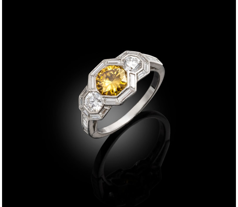 Designed in the Art Deco style, the centre set with a brilliant-cut diamond of warm brownish yellow tint, between an additional pair of brilliant-cut diamonds, each within an octagonal frame seamlessly set with calibré-cut trapezoid and rhomboid baguette diamonds, the shoulders accented with lines of channel-set carré-cut diamonds.