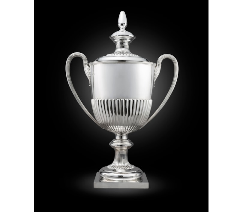 The cup on a square fluted pedestal foot. The main body also half-fluted. The long reeded D-shaped handles terminating in acanthus leaves. The cover mirroring the base with fluted.