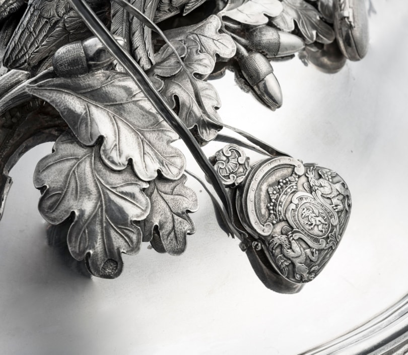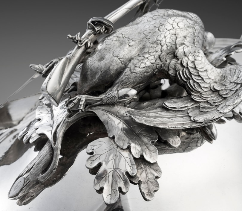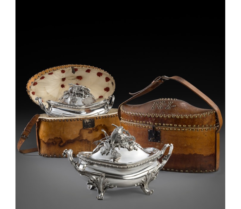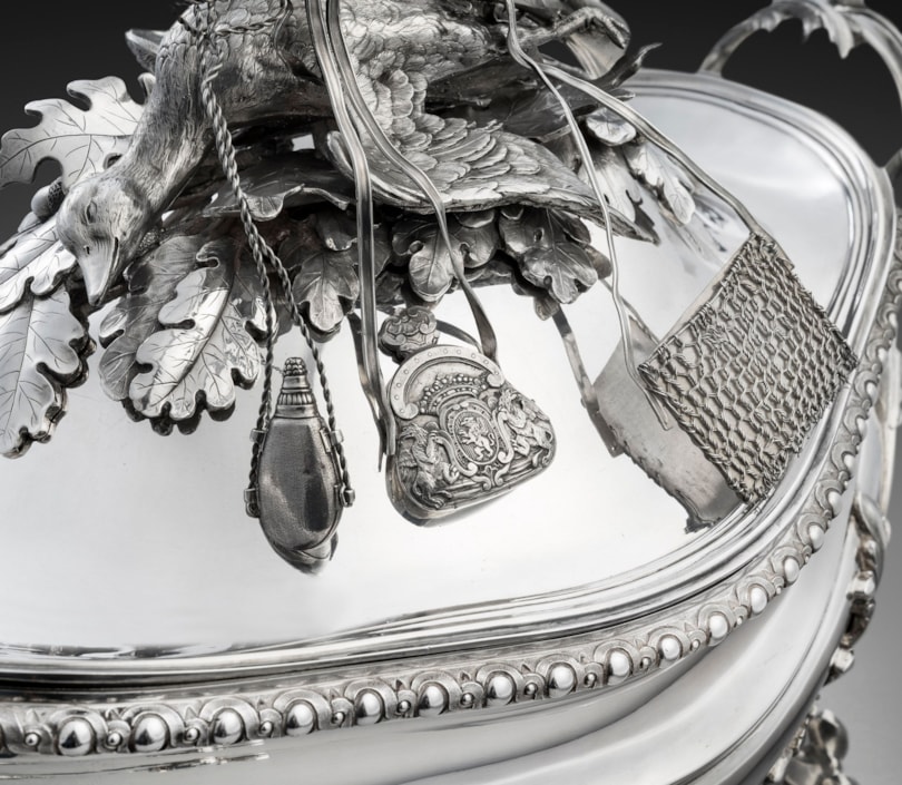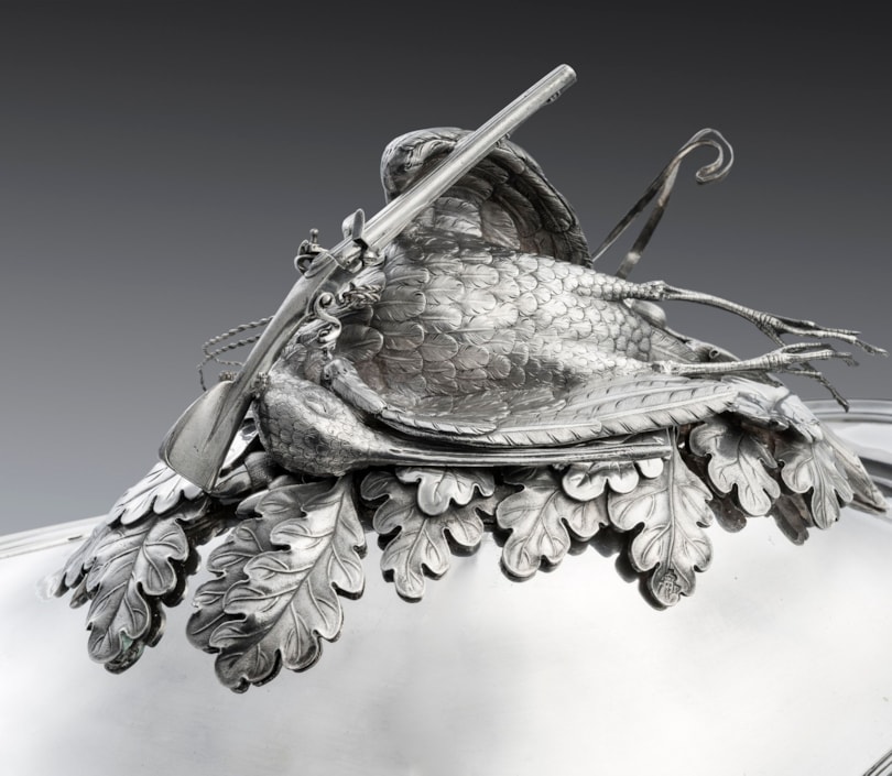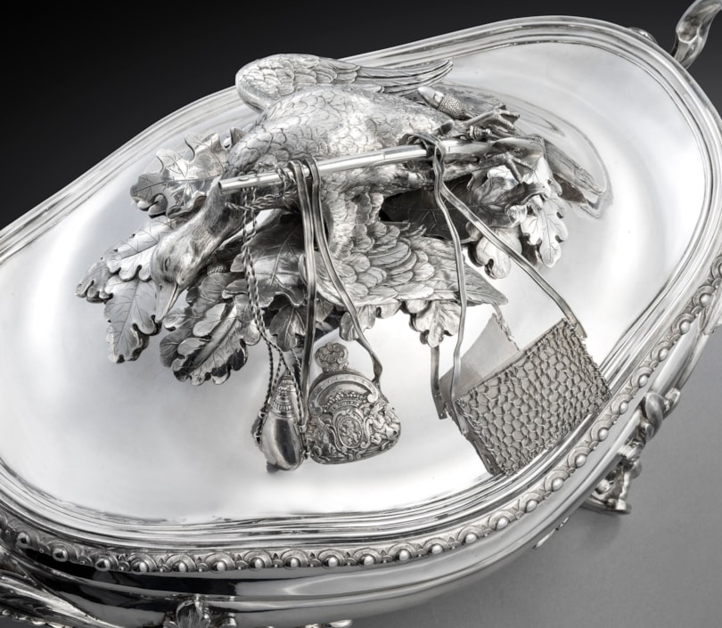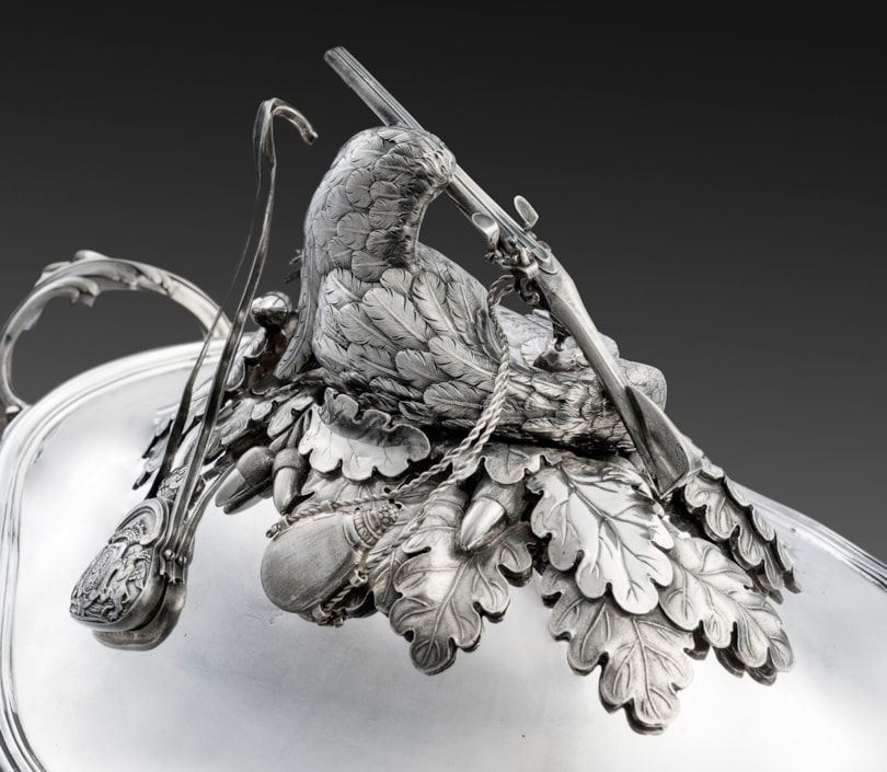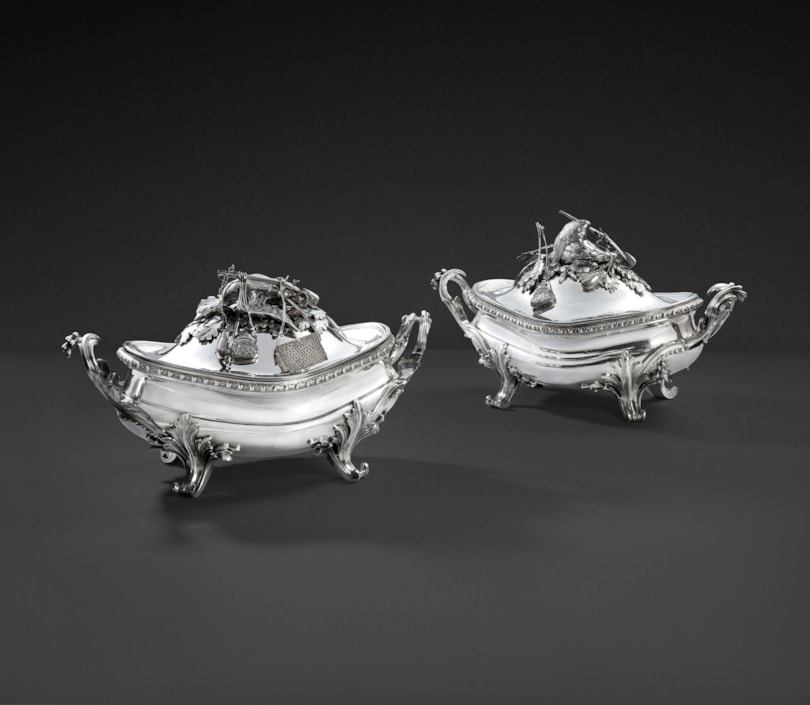 Each of oval form on four cast and applied scrolling acanthus feet, the asymmetrical rocaille cast and applied handles emerging from the scroll feet on either side, and the voluptuous form of the main body finished with a chased gadrooned rim. The reeded edge covers each adorned with a finely cast and applied finial in the shape of a game bird - one with a goose, the other with a snipe – each lain upon a branch of cast oak leaves with acorns, the goose underneath a rifle, the snipe beneath a Flintlock gun. Delicately chased and ornamented bags hang from the guns of both with finely cast silver straps. The inserts each with small scroll end handles. All the individual items bear incised weight indications and numbers.