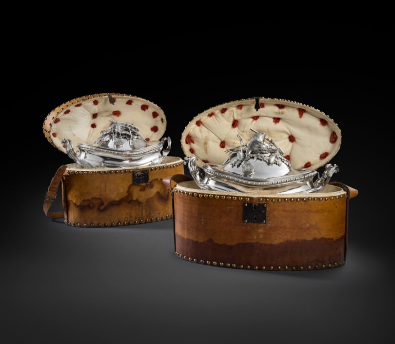 This well conserved pair of tureens with original cases, first bought by Colonel Samuel von Tscharner, eventual General of the infantry in the service of Sardinia-Piemont, had remained part of the family collection by decent until recent times. By 1756, Von Tscharner had rendered outstanding services as a representative of Bernese interests by initiating the renewal of important salt supply contacts between Bern and the Kingdom of Sardinia-Piedmont. His promotion to Colonel in 1760 would have assured him a high income as a regimental owner and would have enabled him to buy this stupendous pair of tureens with hunting motifs.