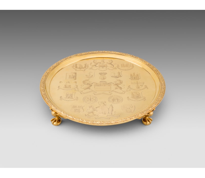 The salver circular and on four-winged claw-and-ball feet with cast acorn and oak leaf border on matted ground. Engraved with a coat-of-arms below a Duke's coronet and surrounded by sixteen further engraved coats-of-arms,
