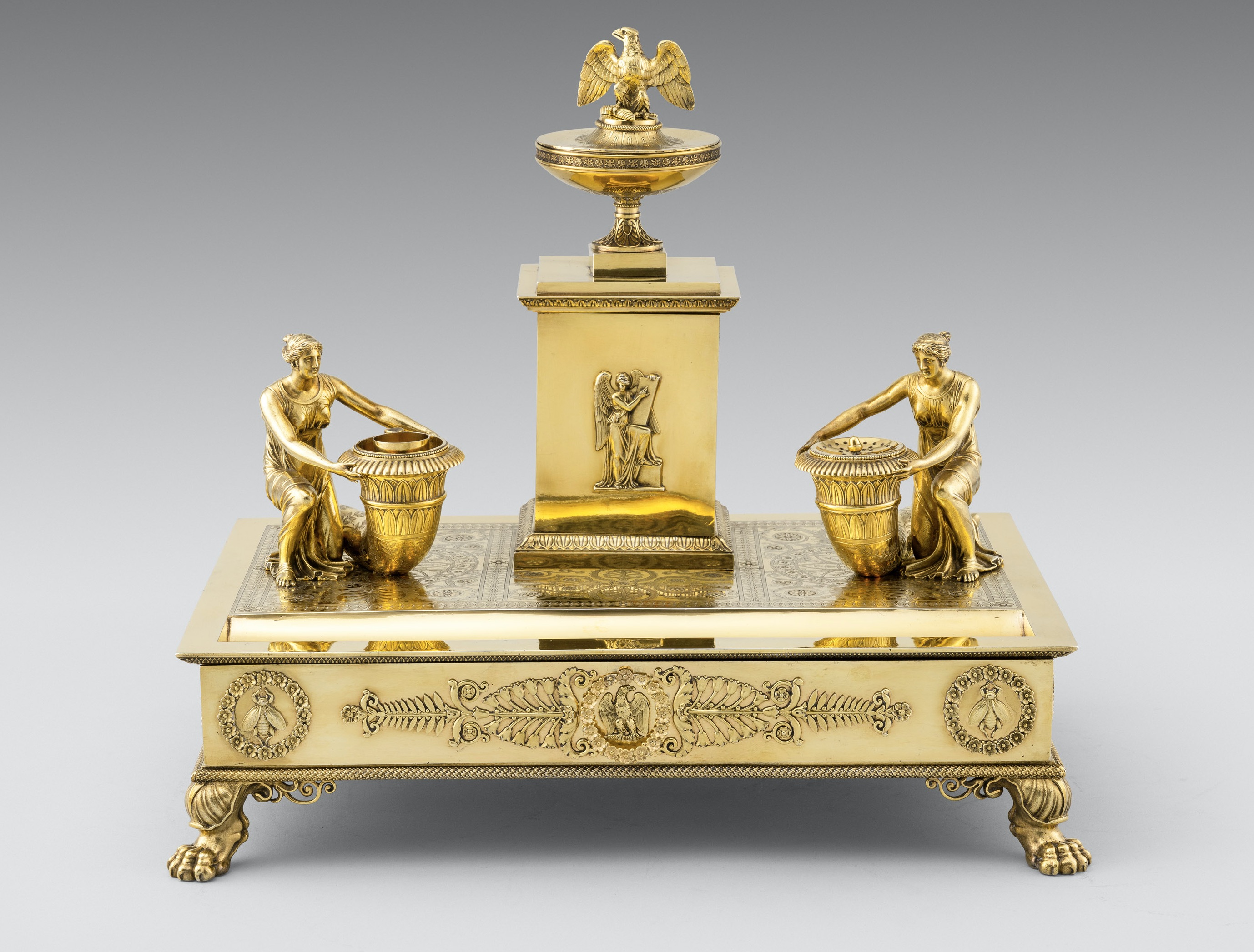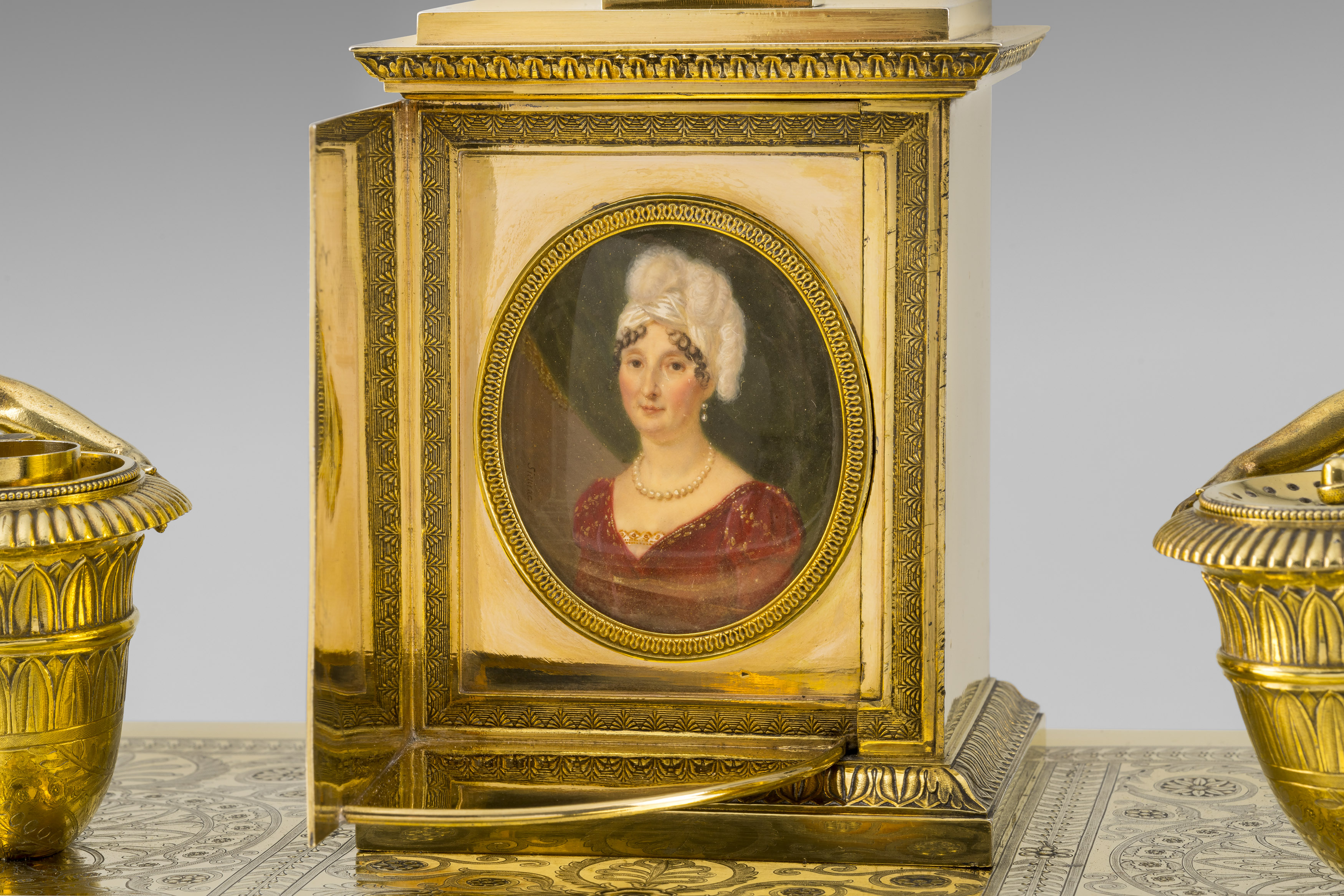 An oblong inkstand, on four foliage and lion's paw feet, the sides applied with bees within foliage wreaths, the drawer front similarly applied and centred by the Imperial eagle within stylised foliage frieze, the flat top applied with two cast and chased kneeling classical female figures, each holding a horn of plenty, one the inkwell, the other the pounce pot, and with square plinth between, applied with foliage borders, winged figure of Victory and an urn containing olive and oak branches representing Peace and Victory, and with urn-shaped finial surmounted by the Imperial eagle. The plinth opens to reveal a miniature portrait by Sieurac of Letizia Ramolino Bonapart, later Madame Mère the mother of Napoleon.