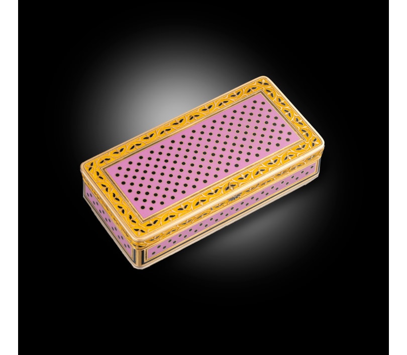 With rectangular, the lid, sides and base enamelled in opaque bright lilac with a regular pattern of black pellets within fine gold circles, enamelled black leaf borders and plain black frames around the side panels, maker's mark, Paris unofficial 2me titre et petite garantie, rim numbered: 118, with note of provenance,