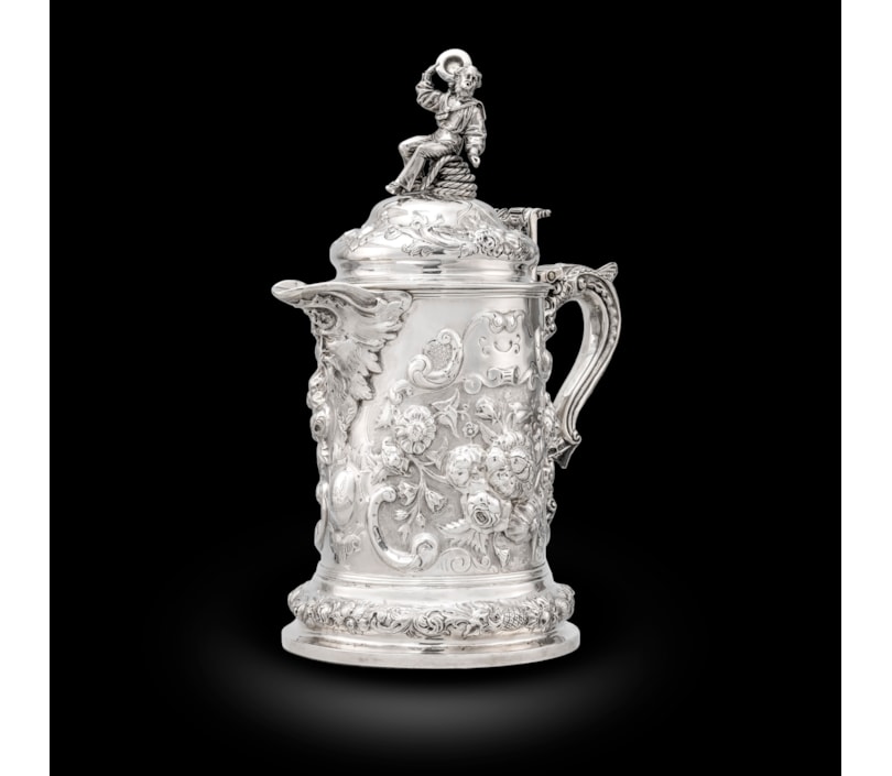 Of cylindrical form, the hinged domed cover with open scroll thumbpiece, topped by a large cast finial of a traditionally dressed sailor singing, seated on a coiled ship's rope, opening to reveal a cavernous gilt interior, to the exterior a leaf-capped double-scroll handle with acanthus leaf terminal, to the opposite side a flared spout with an embossed classical mask of a bearded male to its base, an applied oval armorial plaque below for the 'LEIGHTON' family and the family motto 'DREAD SHAME', the whole elaborately embossed with flowers, fruit, foliage, diaper-work and 'C' scrolls in both high and low relief, an inscribed cartouche to one side in Finnish to 'Walter Petterson' from 'The Association of Finnish Stevedores', on a domed spreading circular base.