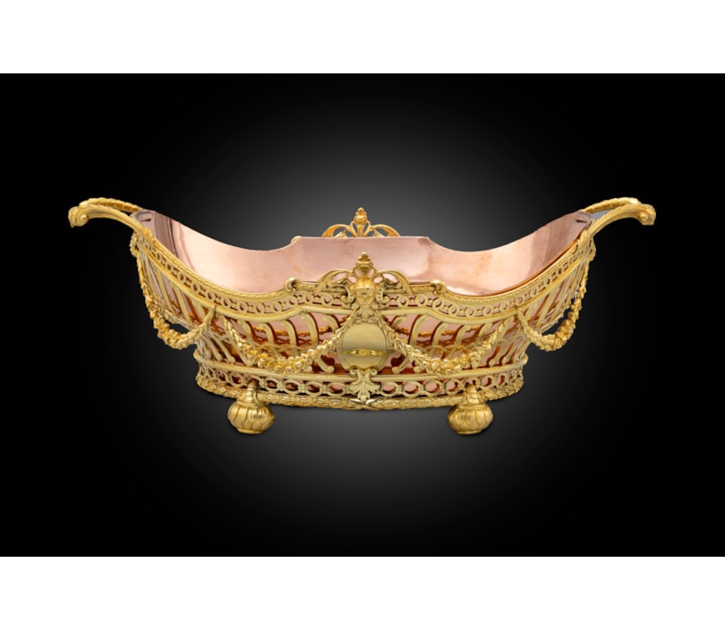 The basket oval in shape, on ball feet applied with foliage. The basket with two scrolling quilted handles, the pierced sides with openwork decoration and swags. The basket centred with a cartouche on each side surmounted by a woman's mask holding garlands of flowers and foliage. The basket with a wonderful pigeon red copper liner.