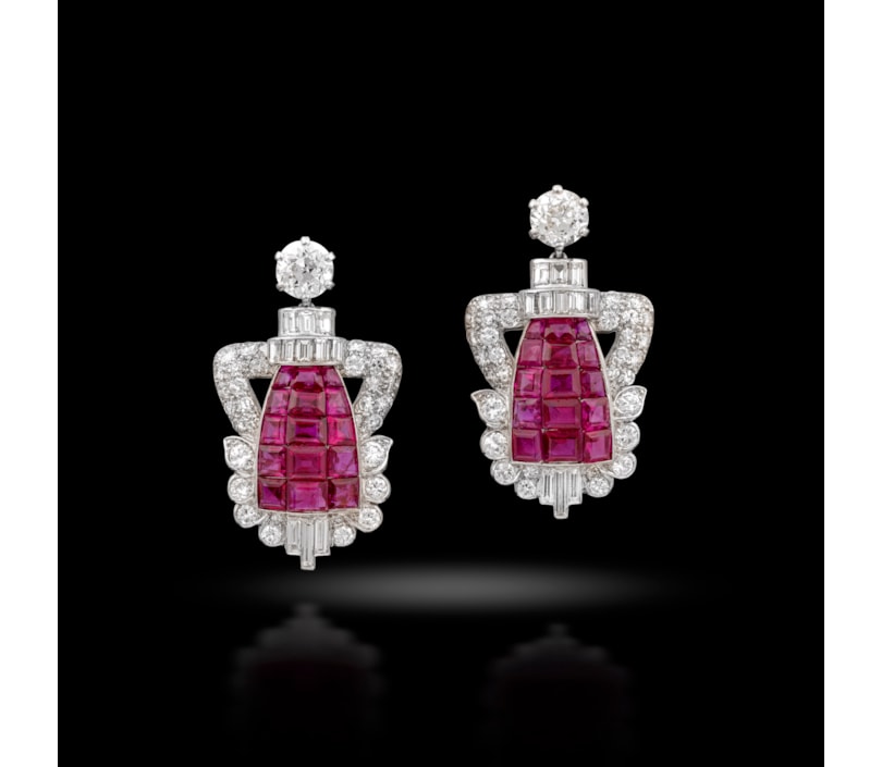The central slightly domed panels are composed of invisibly set graduated calibre-cut rubies, within a geometric surround set with graduated brilliant and baguette cut diamonds, each suspended beneathe a claw set brilliant-cut diamond surmount approx 0.60 carats respectively. Post fittings. Total diamond weight approx 3.70 carats.