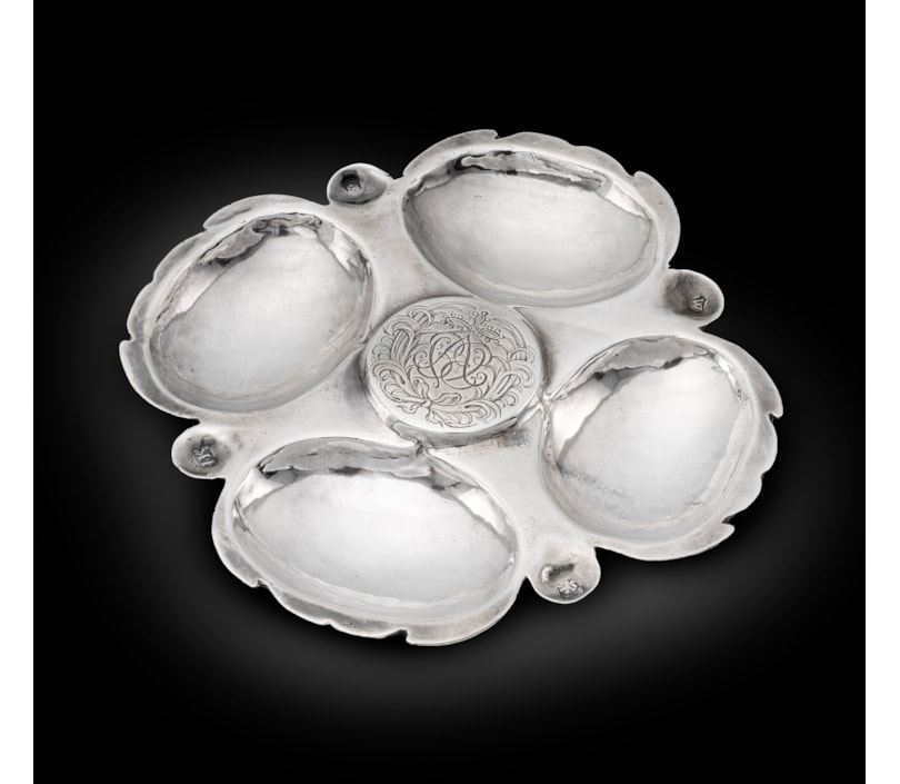 To take four eggs, the central circular section engraved with a cypher within a wreath, the border with four small thumb depressions, raised on four baluster feet, maker's mark "I.K".
