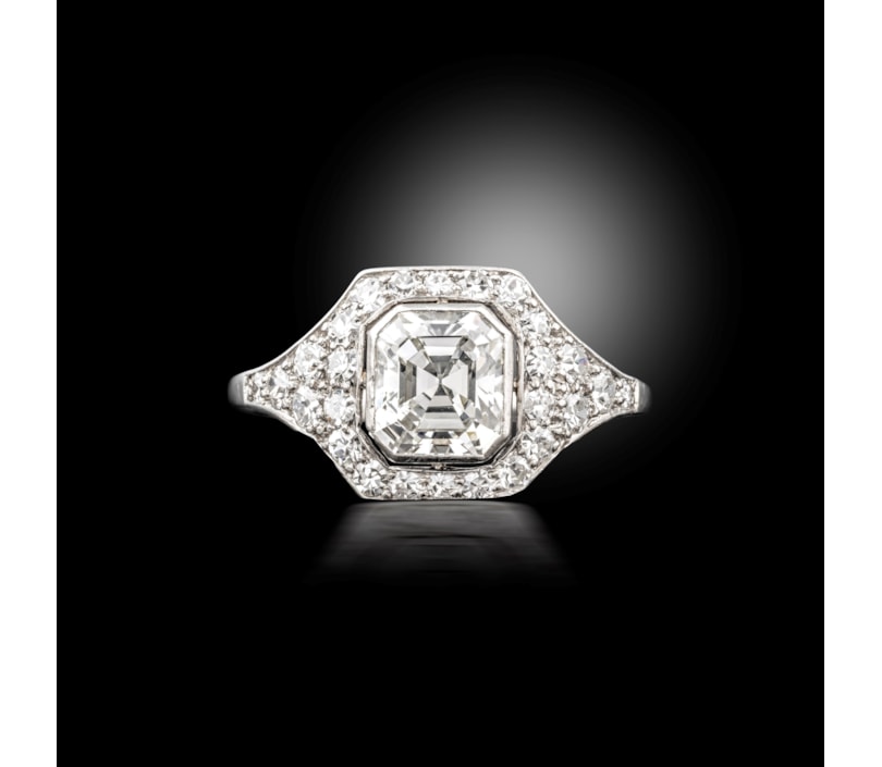 collet set with an Asscher cut diamond, of rectangular form, in a single cut diamond border extending to tapering shoulders, mounted in platinum, stamped within 9599 and trace of 'Pl' for platinum, central asscer cut diamond approx 1.30ct I/J colour VVS2 clarity.