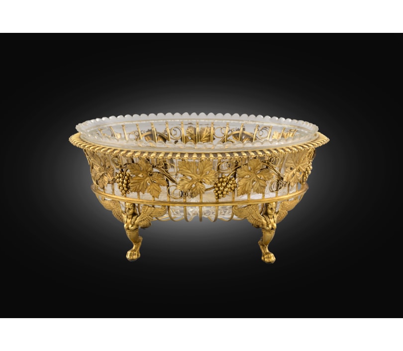 The basket of oval wirework frame with applied grapevine ornament, the rim with egg and dart design, raised on four finely detailed legs modelled as a sphinx with spread wings and paw feet, the central petal form medallion with armorial engraving.