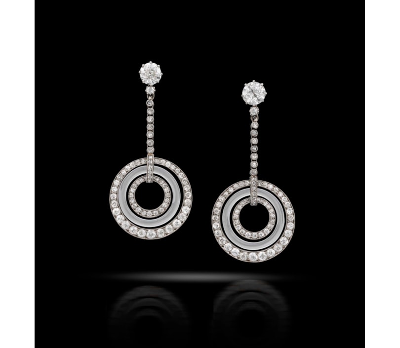 Comprised of two old mine cut diamonds weighing approx 1.25ct respectibely, H/I colour SI2 clarity, suspending a drop of 7 small milgrain set circular cut diamonds with a circular pendant at the bottom, desianed as 2 round loops with milgrain channel set circulour cut diamonds and a rock crystal hoop between the two. pendants detachable. mounted in platinum with gold post.