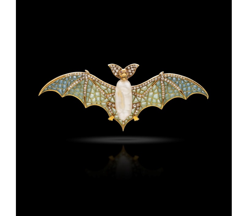 in the form of a flying bat, with the spread wings made up of green plique a jour and small circular cut diamonds. Set with an elongated blister pearl as the body and ruby eyes, all mounted in yellow gold.