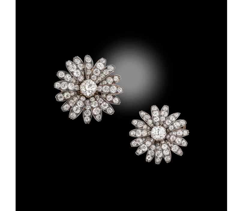 designed as flowerheads with individual petals set with graduating old european diamonds set with central diamonds of approx 2.20ct and 1.50ct respectively.