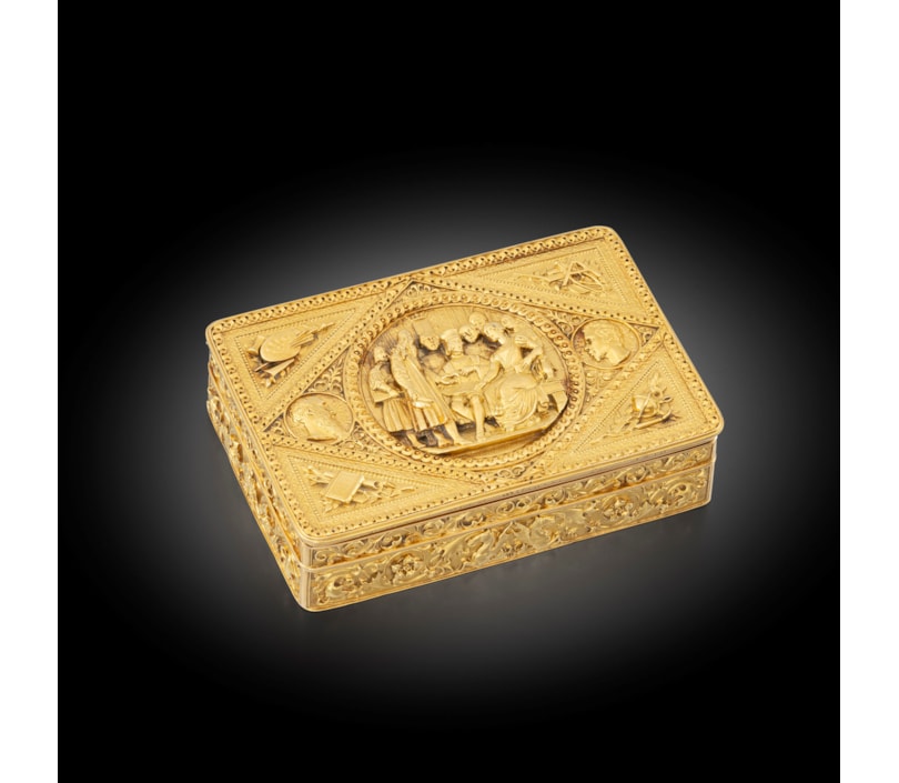 The grotesque decoration is characterised by the depiction of hybrid and monstrous beings, chimaeras, often portrayed as slender and whimsical figurines, which blend into geometric and naturalistic decorations, structured symmetrically, against a monochrome background which, in the case of this gold box, is rendered by a background with a steepled matte finish.