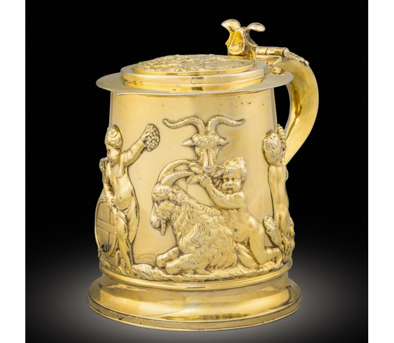 The lid with a cast battle scene, the sides applied with further bacchic putti, the scroll handle with open-work thumbpiece and a cast and applied Bacchic mask. The tankard resting on a plain skirted foot.