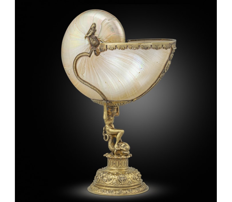 Nautilus shells are a by-product of the European explorations of tropical regions during the Renaissance times. Nautilus originate from marine creatures living in the Pacific and Indian Oceans. The shell magically glows when the outer skin is removed, adding to these objects' whimsical essence. For this reason, shells were imported as natural marvels from tropical islands and became lustrous treasures that would have been exhibited in a Renaissance Wunderkammer. Wunderkammers, from German, translates as "room of wonder" or "cabinet of curiosities, " consisted of privately-owned collections of manufactured arts and natural arts, with minerals, ivory, ostrich eggs, coconut shells, nautilus shells, and other exotic objects.