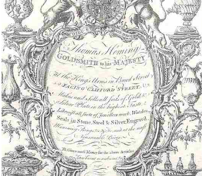 The son of a Midlands merchant, Thomas Heming was apprenticed to Edmund Bodington on March 7, 1738, and turned over on the same day to the Huguenot goldsmith Peter Archambo. He registered his first mark in June 1745; in 1760 he was appointed principal goldsmith to King George III, in which capacity he was responsible for supplying regalia and plate required for the coronation. Heming held this appointment until 1782, when he was ousted after an investigation into his apparently excessive charges. Grimwade (1976, p. 543) comments that "some of his earlier surviving pieces in the Royal collection show a French delicacy of taste and refinement of execution which is unquestionably inherited from his master Archambo." Among Heming's outstanding works are a silver-gilt toilet service made for Queen Caroline of Denmark in 1766 (Dankse Kunstidustrimuseum, Copenhagen; Hernmarck 1977, pl. 727) and a wine cistern of 1770, made for Speaker Brownlow (Belton House, Lincolnshire; Grimwade 1974, pl. 12).