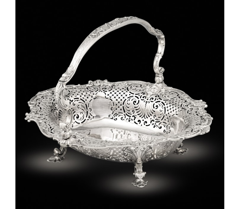The basket on four scrolled shell feet terminating in spreading acanthus leaves. The main body pierced with geometric designs of anthemion, scrolls and cross hatching . The body rising to a border of shell, flolral and foliate border. The handle with flowing water, shell and swan head decor terminating on a bed of scales and masks.