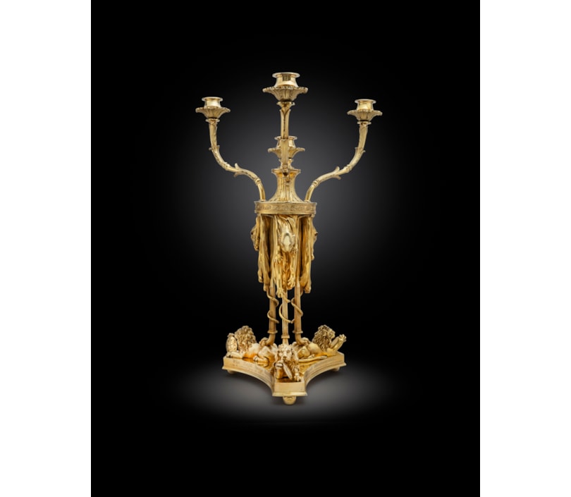 The detachable acanthus-wrapped branches issuing from a circular central sconce raised on three square fluted columns terminating in claw feet and hung with lion pelts.