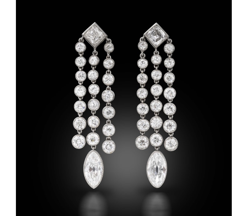 set with an old mine cut diamond suspending 3 rows of milgrain set circular cut diamonds of approx 0.10ct each, the central row set with an old marquise cut diamond drop of approx 1.10cts. TCW approx 3-3.50cts each. Mounted in platinum.