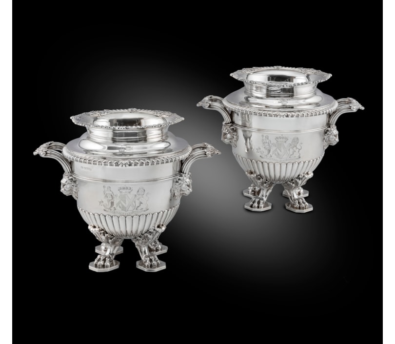 Of urn shape with detachable upper ring and interior liner, the upper ring with a gadrooned and floral decoration, the body with two scrolled handles terminating in lion's head mounts and a gadroon-decorated rim, the lower body with a wide gadroon pattern and standing on paw feet attached with acanthus decorations. Each with a coat of arms with a lion and mermaid engraved, "PER MARE PER TERRAS"