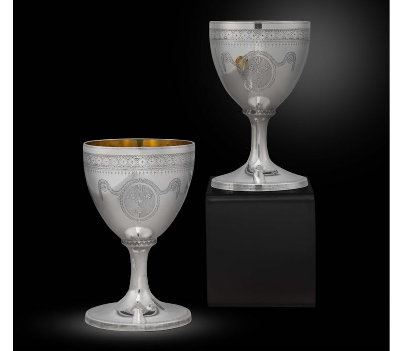 Each on spreading foot, the ovoid bowl with bright cut decoration of geometric motifs, gilded inside, engraved with a coat-of-arms within neoclassical laurel garland, marked underneath.