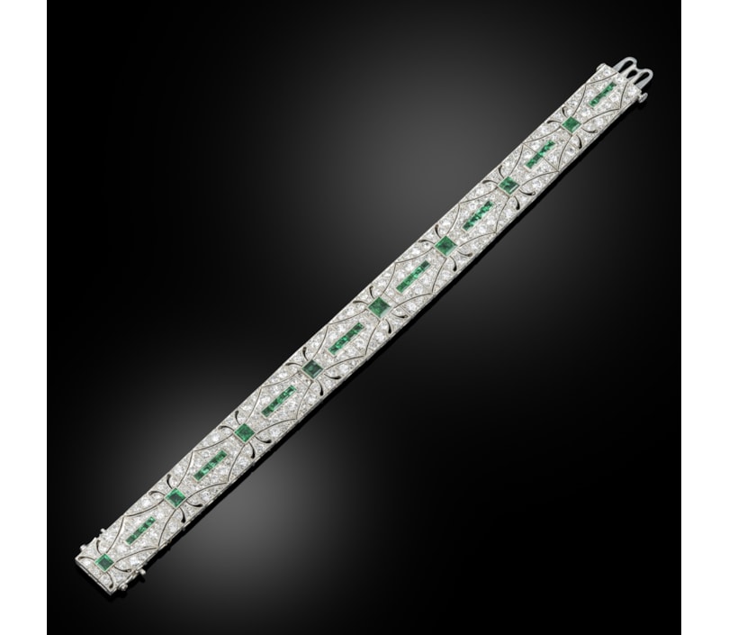 each panel milgrained edged, set with round brilliant cut diamonds. Every third panel set with a slightly larger square cut emerald, with the pannels in between set with four smaller square cut emeralds. In original fitted box.