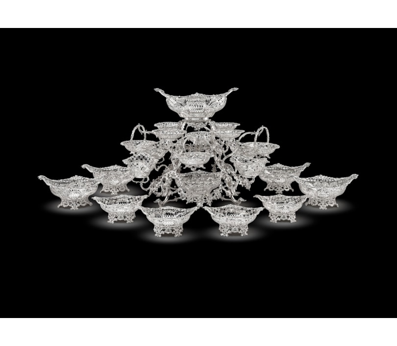 The frame hung with floral swags raised on four scrolling feet, surrounded by twelve branches, four with hanging footed circular baskets, eight branches terminating with circular dishes, four with circular baskets and four with navette-form baskets, centering two tiers of central navette-form baskets and an interior pineapple-form finial; together with eight matching sterling silver footed, pierced baskets.