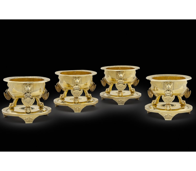 "Egyptian" salts in every particular with lion head masks on monopodic sphynxes paws. The paws with heraldic shields bearing laurel leaves.  The three paws in turn resting on circular bases with anthemion decorated feet.