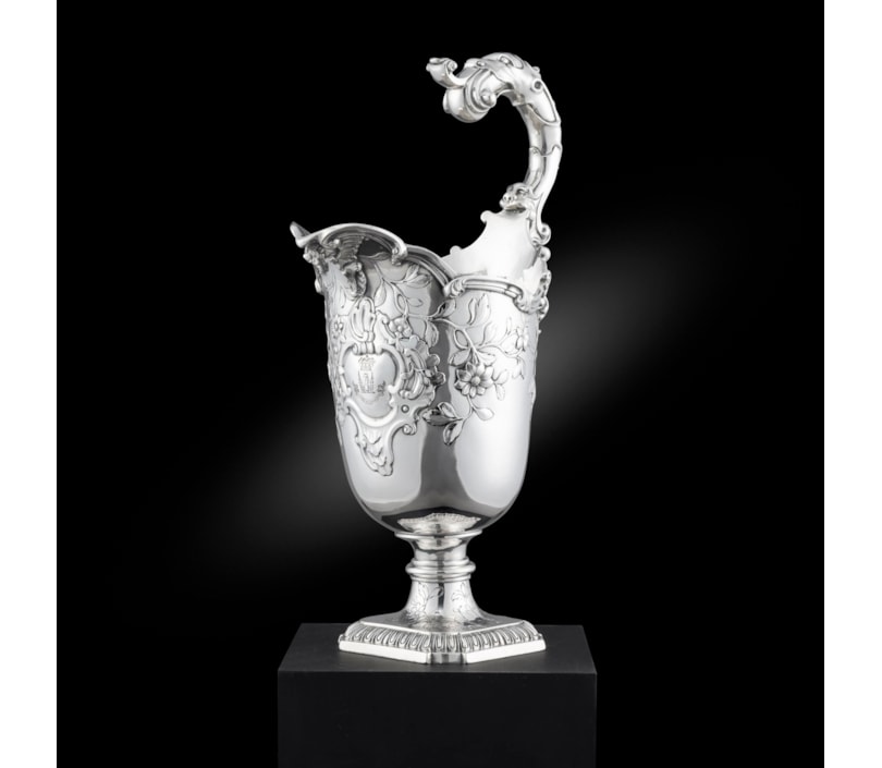 The Royal goldsmith has produced a masterpiece in this ewer. It sits on a square pedestal foot with gadrooned edge and fabulously chased flowers and foliate décor. The main body raised and chased in a similar way with blooming roses, rosehips and spring flowers and tendrils forming a cartouche to the front with the engraved coronet, motto, and crest of Baron Ducie. The reeded rim of the main body terminating in a grotesque mask below the lip of the ewer.